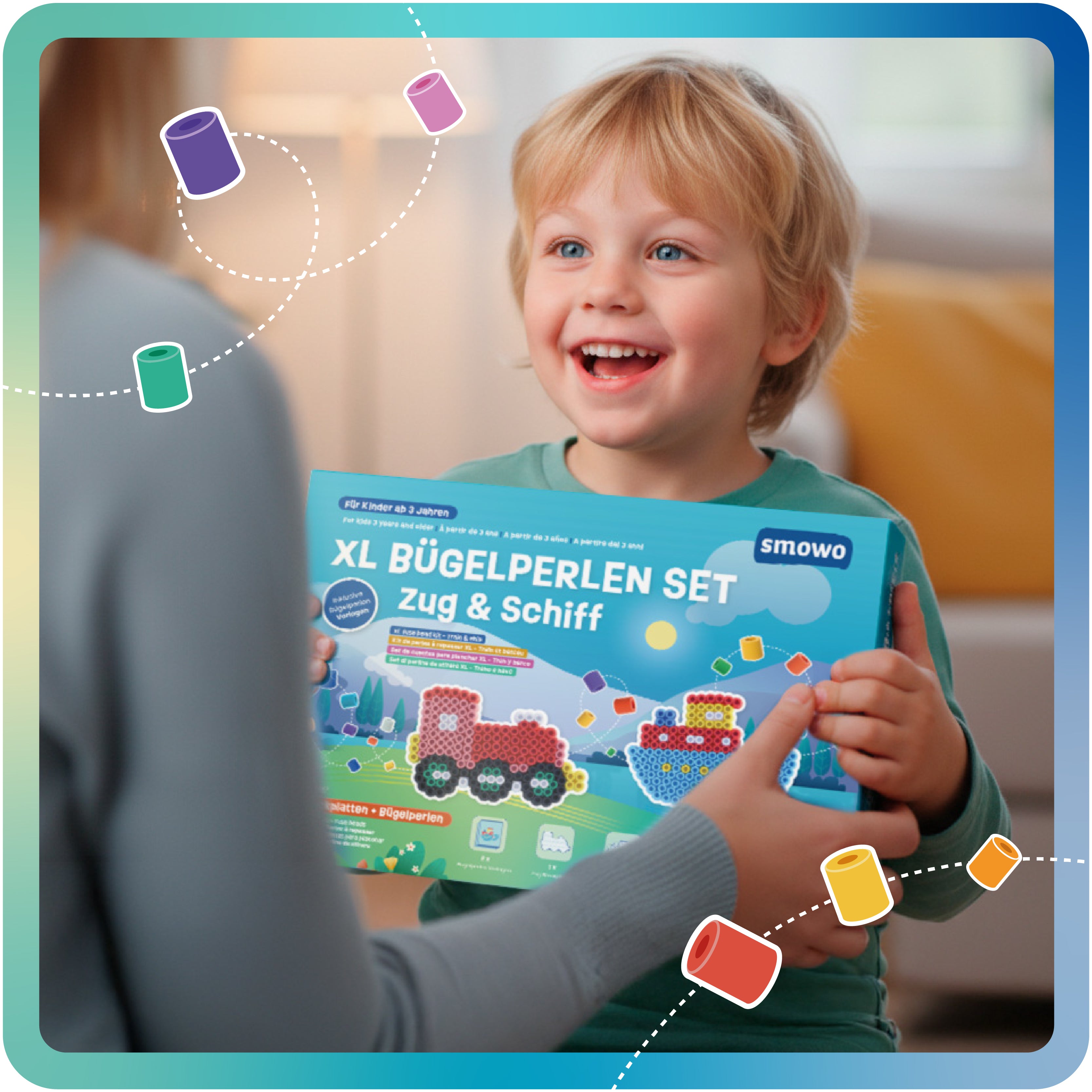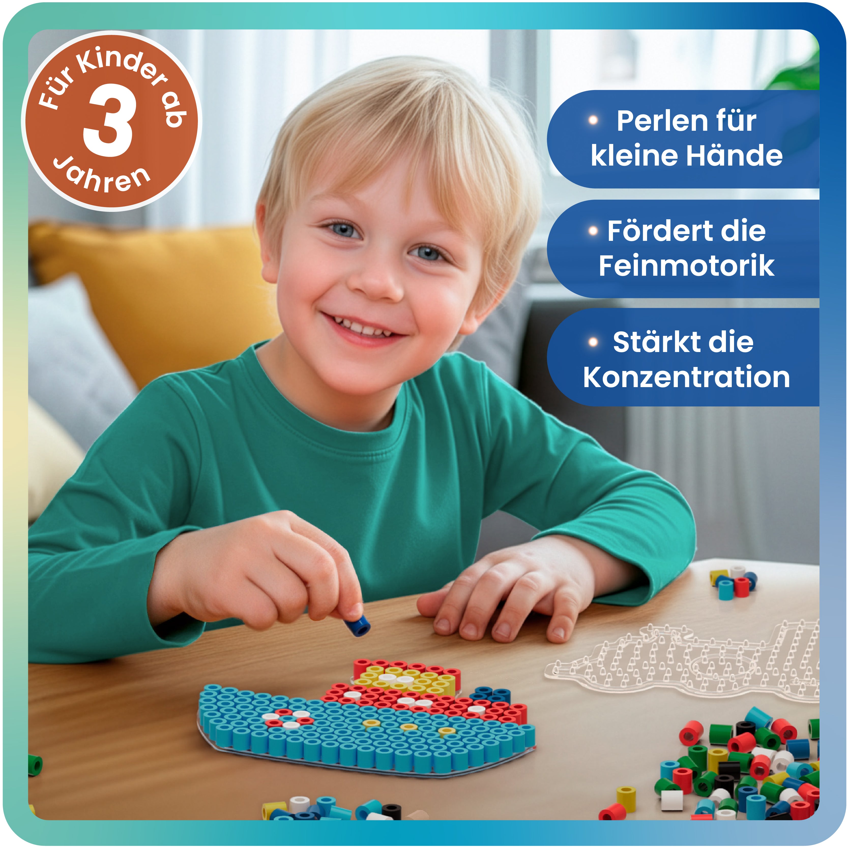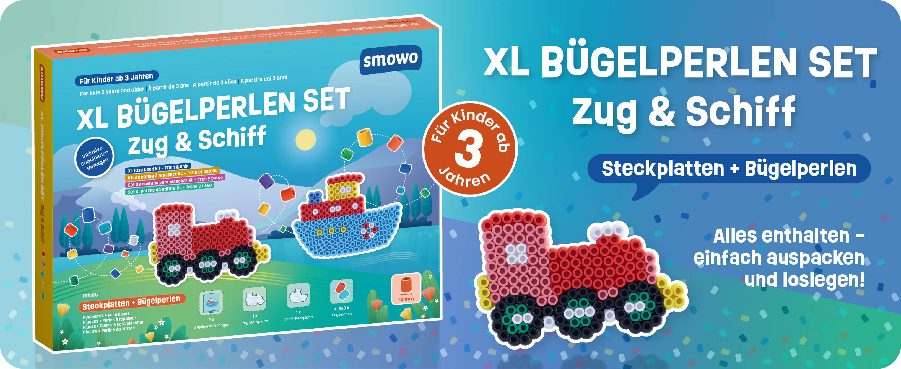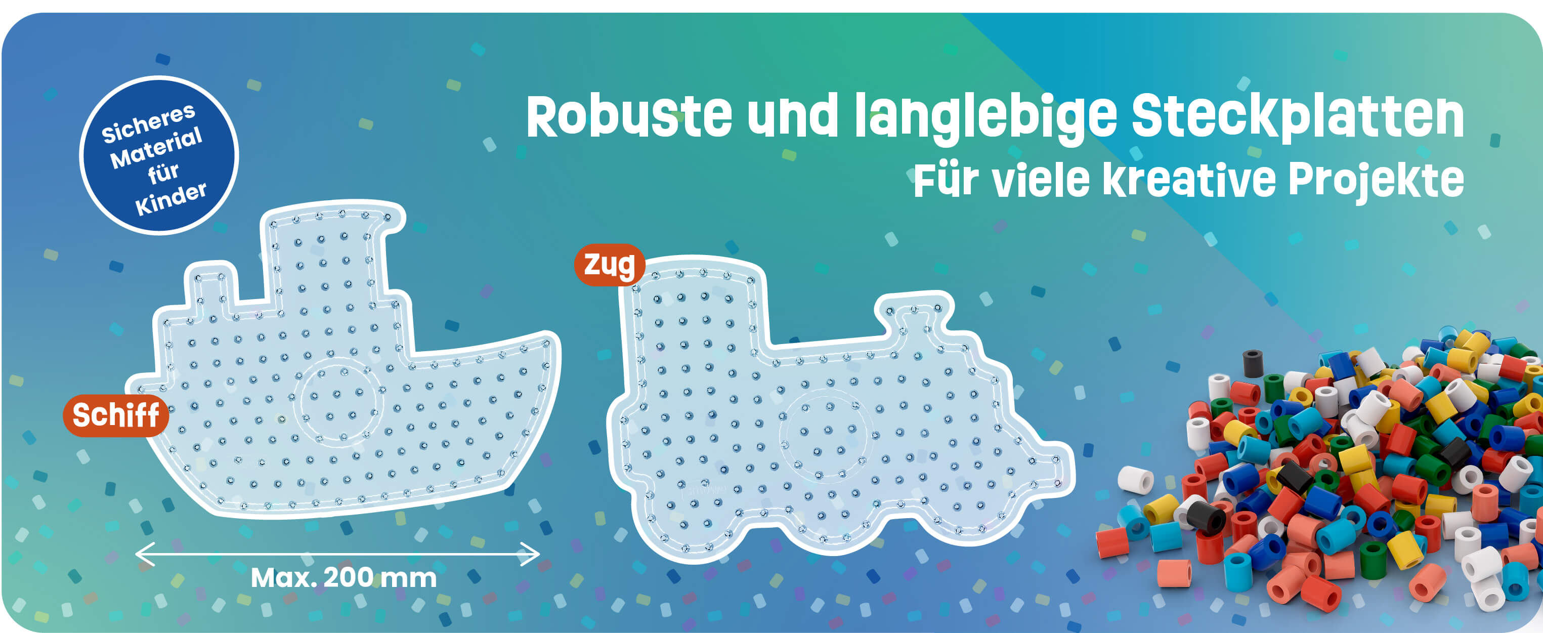 Dieses liebevoll zusammengestellte Bastelset enthält alles, was kleine Kreativfans für den perfekten Start brauchen: zwei grosse XL Steckplatten in den Formen Zug und Schiff sowie 10 mm Bügelperlen in acht bunten Farben. Ergänzt wird das Set durch fröhliche Motivvorlagen, die einfach unter die transparenten Platten gelegt werden können. So entstehen im Handumdrehen zwei tolle Designs – ideal für Kinder ab drei Jahren, um spielerisch ihre Feinmotorik zu fördern und erste Bastelerfolge zu erleben.