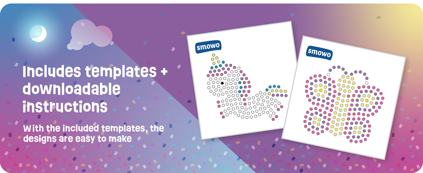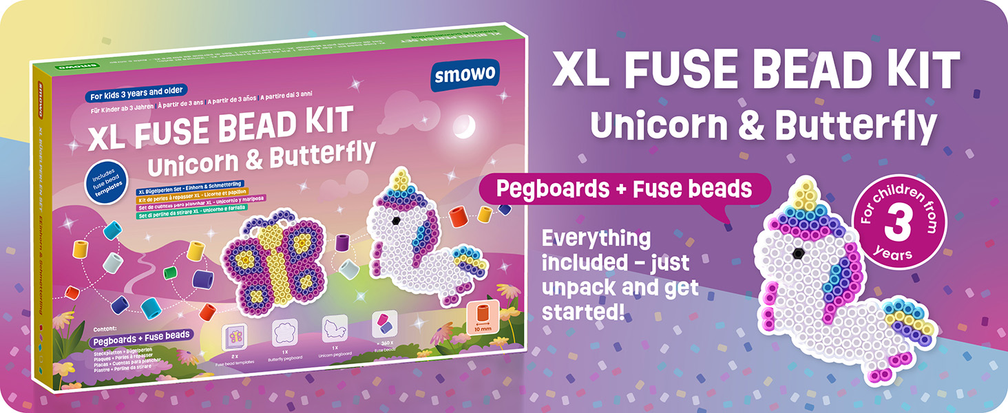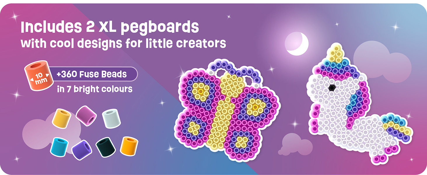 This carefully designed craft set includes two large XL pegboards in the popular unicorn and butterfly shapes, along with 10 mm fuse beads in 7 bright colours. Matching, colourful design templates are included and can simply be placed underneath the transparent boards, allowing children to create two beautiful designs with ease and enjoy their first creative achievements.