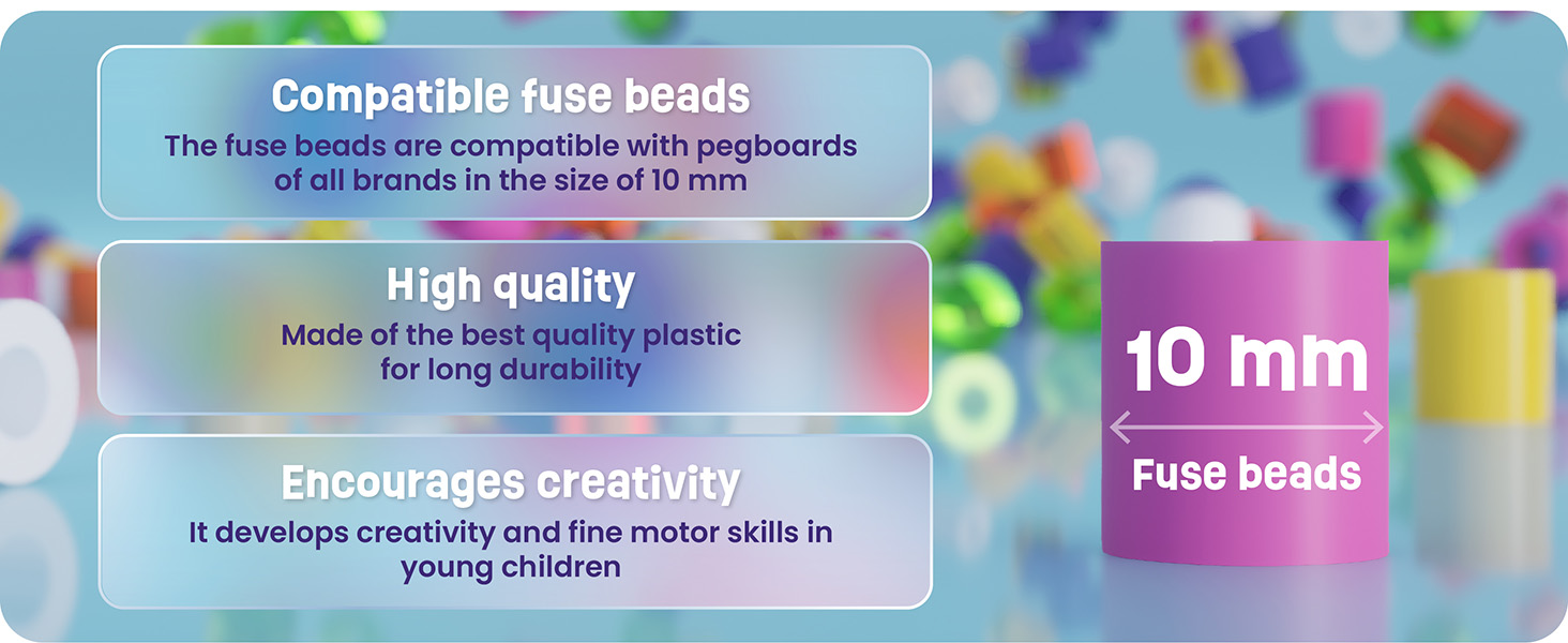 Whether as a birthday present, for Christmas or Easter, on holiday or for creative afternoons at home, this set is loved by both girls and boys. The beads combine perfectly with our pegboard sets and are also compatible with common pegboards designed for 10 mm beads.