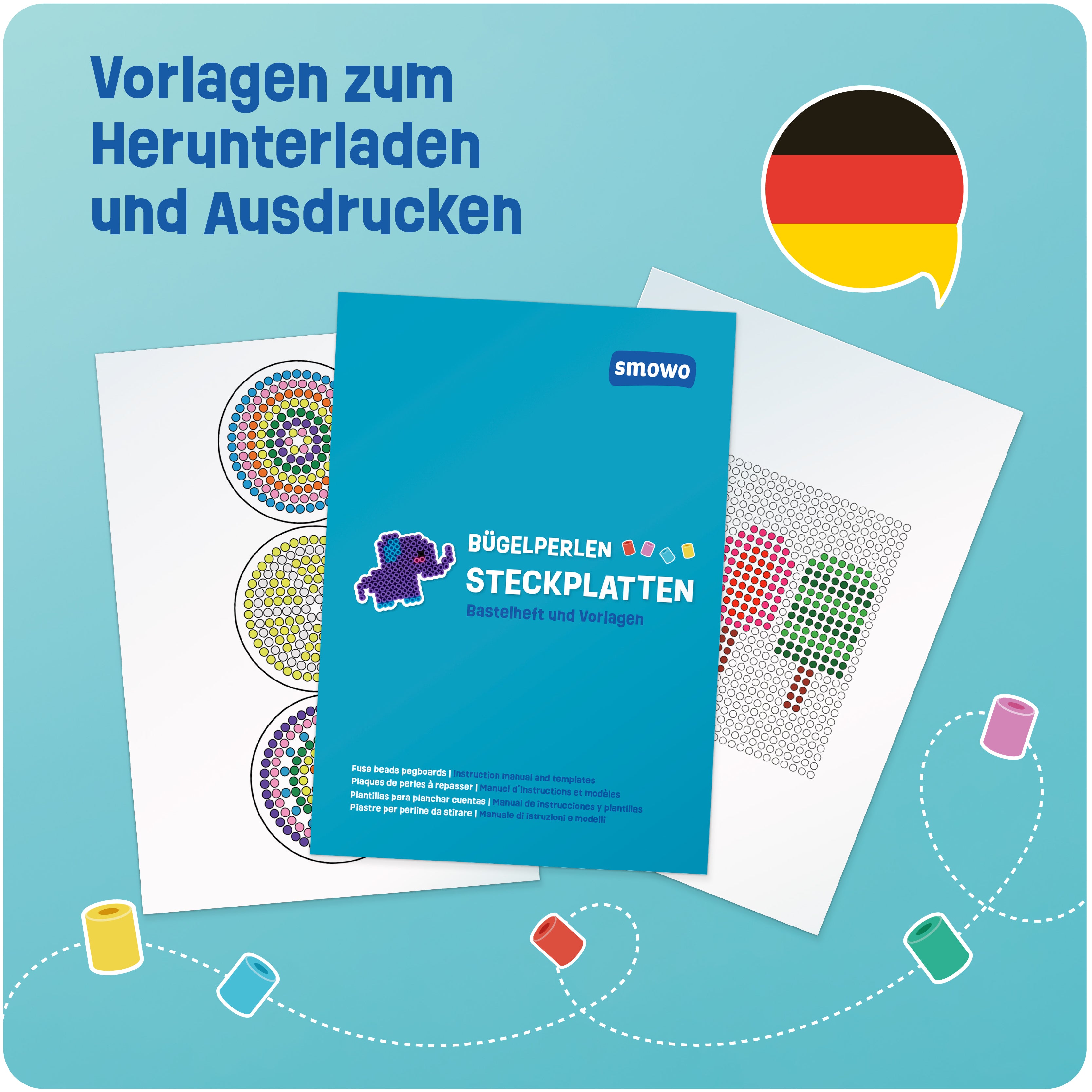 Mit diesem Set erhalten Sie auch Anleitungen und Motivvorlagen zum Herunterladen und Ausdrucken. Diese bieten bunte und kreative Perlenmotive, die ideal für Anfänger, Fortgeschrittene, Kinder und Erwachsene sind. Sie können die ausgedruckten Bügelperlenvorlagen unter die transparenten Schablonen legen.