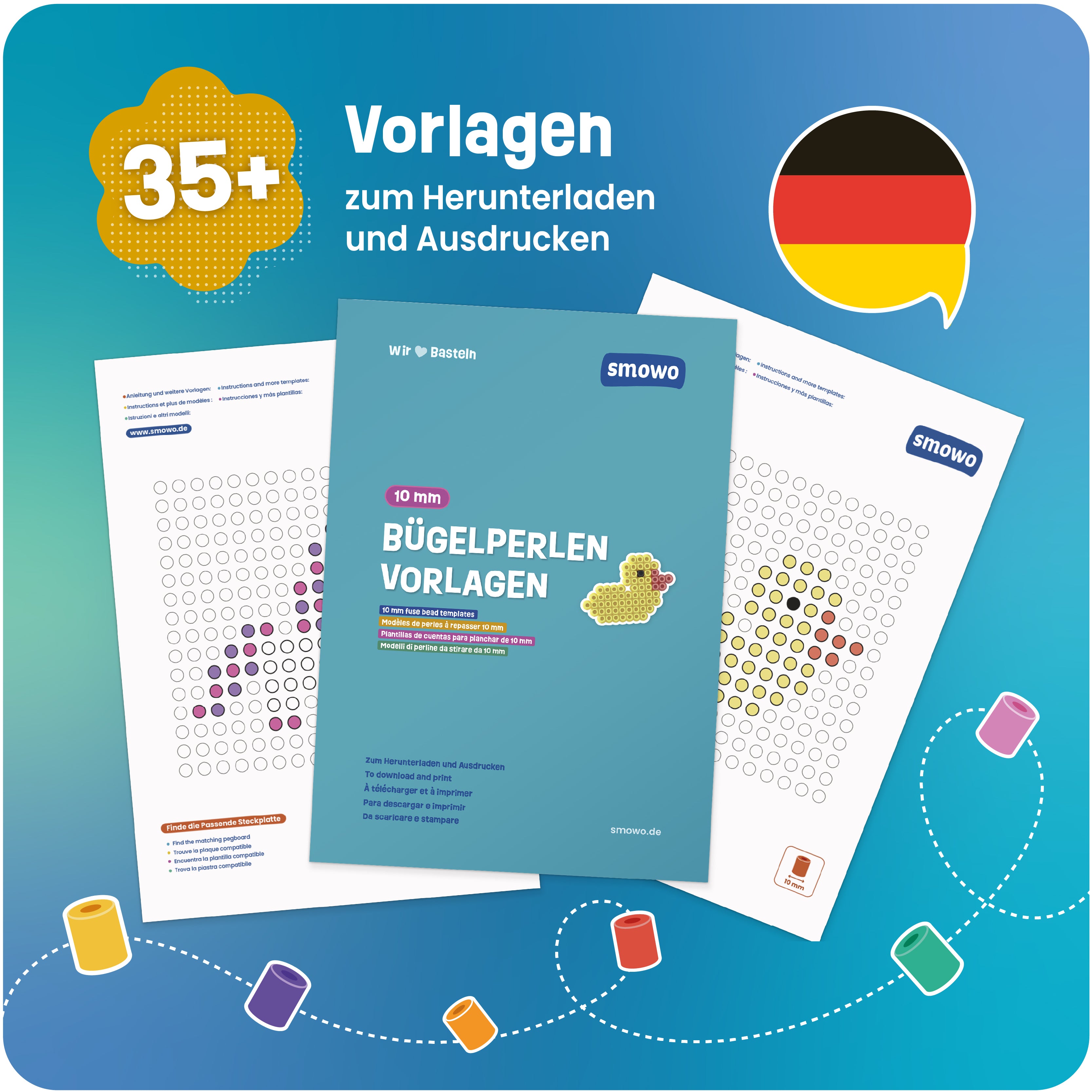 Wir bieten auch unsere selbst kreierten Motivvorlagen, inklusive einer Bedienungsanleitung, die Sie kostenlos herunterladen und ausdrucken können. Die vielen farbenfrohen Bügelperlenvorlagen können unter die transparenten Steckplatten gelegt werden, um eine einfache und unterhaltsame Bastelerfahrung zu ermöglichen.